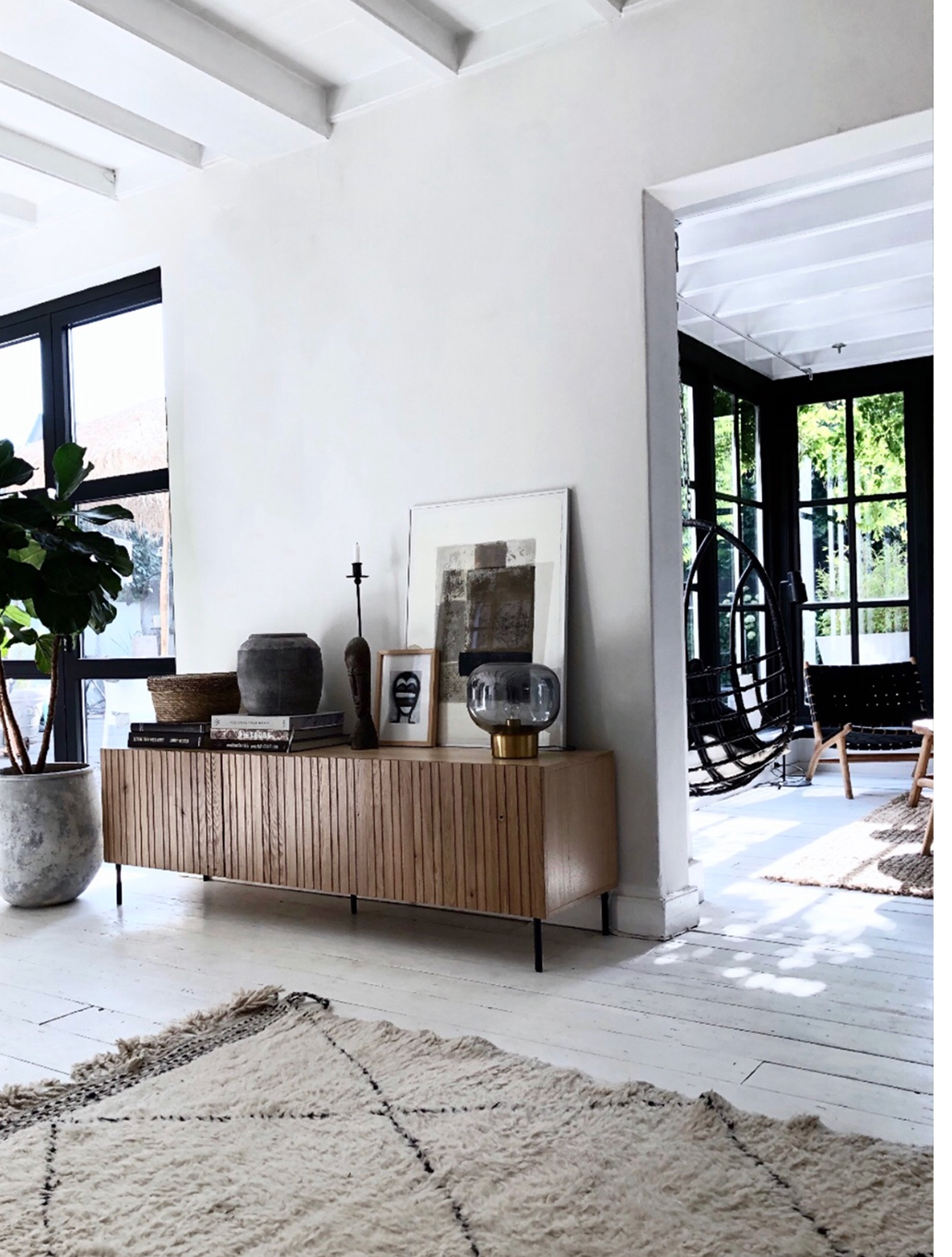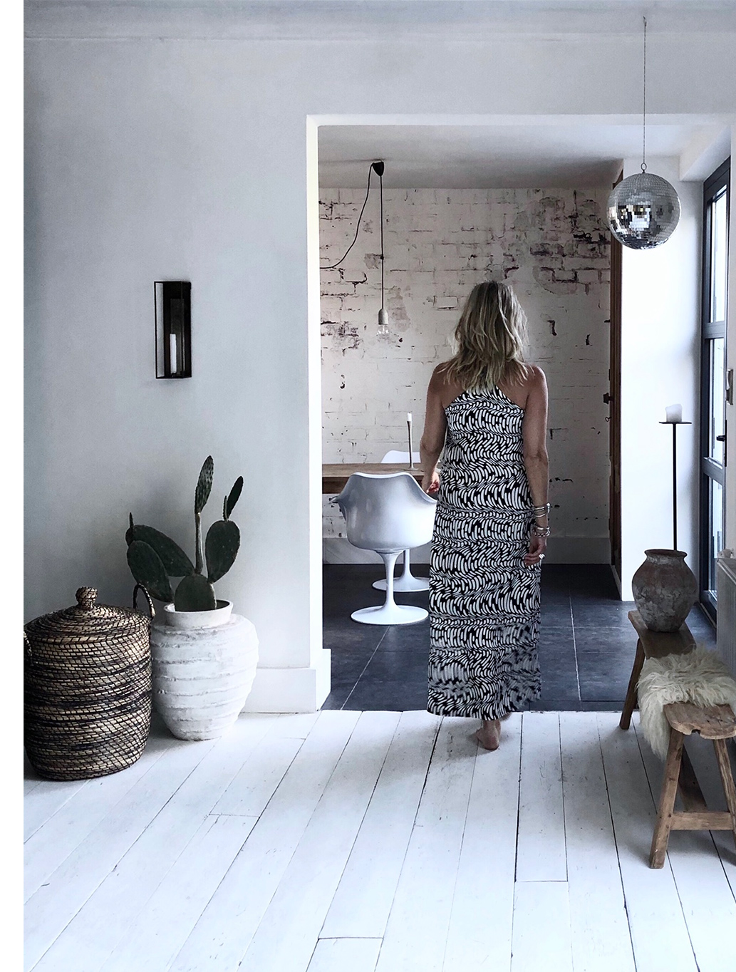 Het huis en ook de tuin heeft de afgelopen 25 jaar al heel wat metamorfoses ondergaan, maar mijn stijl is over het algemeen wel hetzelfde gebleven , hooguit iets strakker de laatste jaren, maar dat komt ook omdat er natuurlijk steeds meer mogelijkheden zijn, wat echt wel een luxe is, want ik wist altijd wel precies wat ik wilde, maar vaak was dat er nog helemaal niet, dus dan maakten we het maar zelf. Wat kleur betreft ben ik ook heel standvastig, namelijk geen kleur! Zwart, wit en naturellen blijven altijd de basis van mijn interieur. Af en toe een kleurtje in de vorm van accessoires. Als je het zat bent kan je ze tenminste makkelijk weer veranderen. In de logeerkamer heb ik trouwens wel een wand geverfd in Ibizagroene kalkverf, maar omdat ik daar niet dagelijks kom raak ik daar niet snel op uitgekeken.
