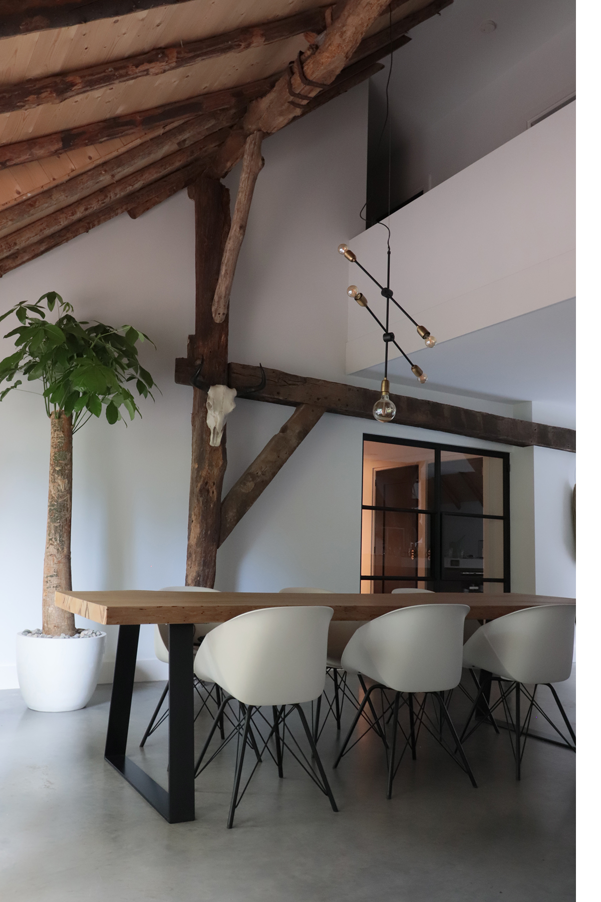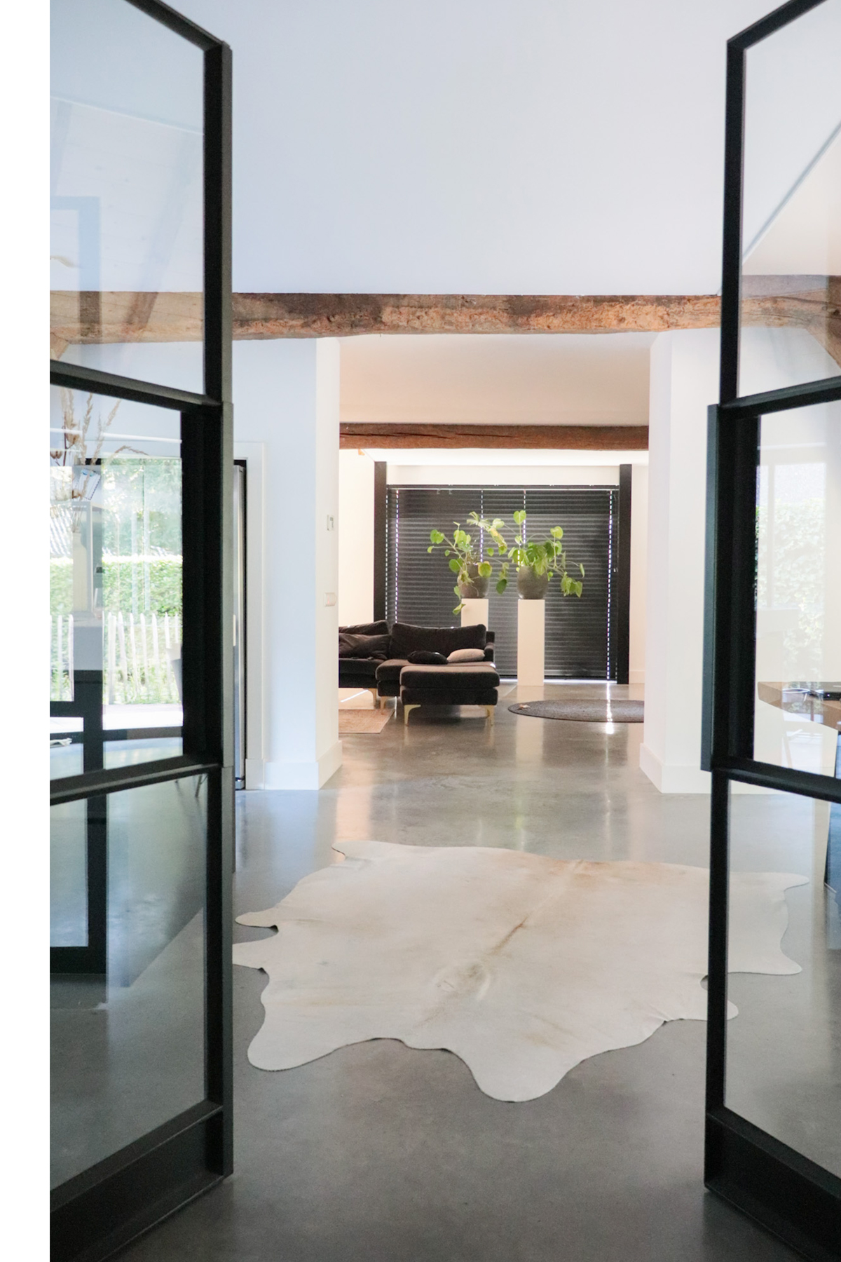 Onze stijl past precies in de boerderij. Ik zou dezelfde stijl aanhouden, strak, minimalistisch maar wel cozy en warm door gebruik van natuurlijke materialen en een touch van aaibare stoffen zoals de heerlijke velvet bank en sofaβs. Eigenlijk niet veel anders dan dat het nu is.