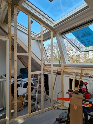 Het uitmeten was nog een precies klusje aangezien er een wand geplaatst zou worden die in de dakserre tussen raam 2 en 3 zou komen en aan de andere kant op het einde van de dakkapel. Een scheve muur is niet handig, dus meten is weten!