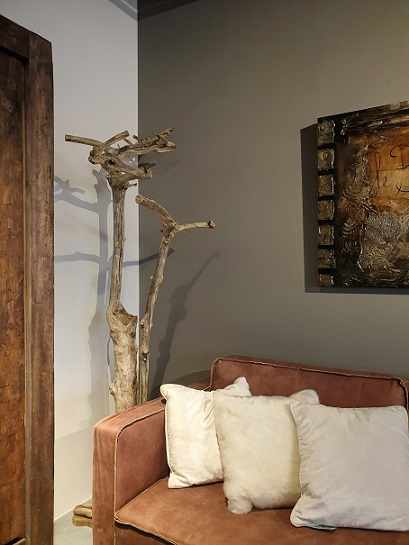 Ik ben verliefd op die aparte vorm van de boomstam tafel en vind de combi bankje met stoelen ook te gek!