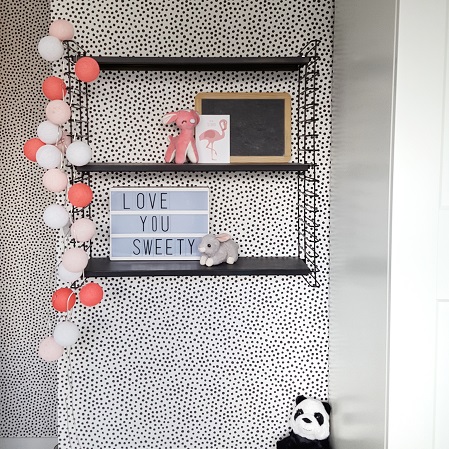 De finishing touch zijn de macramΓ© hangers vanΒ Druiventuintje en natuurlijk de muurstickers vanΒ label27 , de hartjes en de driehoekjes. Je plakt ze gewoon random op de muur. Maakt niet uit hoe, het staat hoe dan ook gezellig!