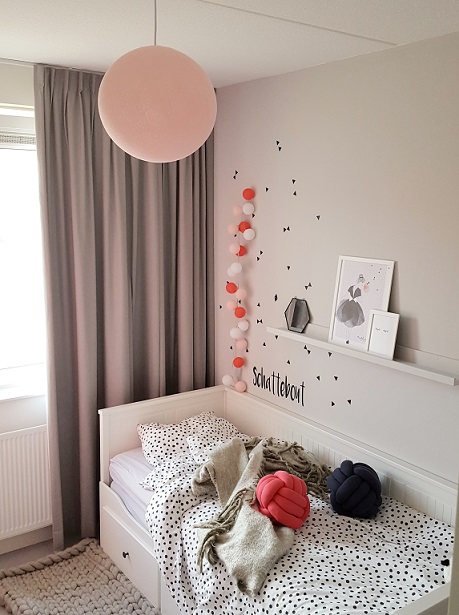 Ik ben zeker niet van het minimalistische, dus er kon nog meer bij ;). En aangezien ik nu toch kleur bekend had, ging ik maar gewoon door met kleurige cotton balls (cottonballlights.com). Op de site zag ik de kleur βcoral pinkβ, dat was natuurlijk een match made in heaven. Ik stelde een slinger samen met de coral pink, white en light pink. En om het helemaal af te maken ook een hanglamp light pink voor Pien dβr kamer. Wat staat dit gezellig!
