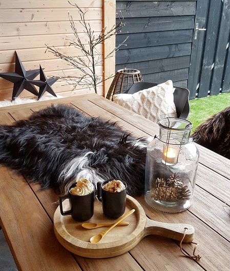 Daar heb je op zich niet heel veel voor nodig. Vooral veel schapenvachtjes, kaarsen, natuurlijke materialen en natuurlijk warme chocomelk met slagroom. Dieย smaakte heerlijk overigens!!ย ;).