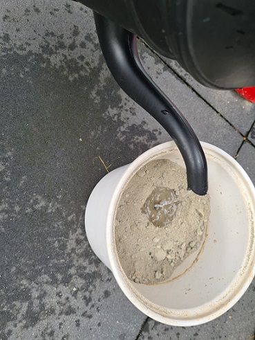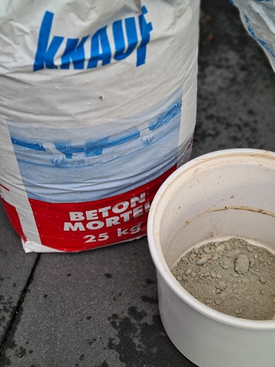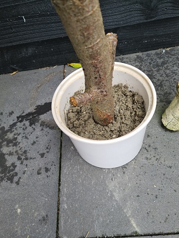 Er was wat protest van Mike want gedoe en troep in de auto, maar…. even later lag ie in de auto ;). Thuisgekomen heb ik de voet in beton gegoten. Heel simpel! Gooi wat betonmortel in een oude pot, water erbij, goed roeren, tak erin zetten (en deze stutten zodat ie niet omvalt) en vervolgens een paar dagen laten drogen.