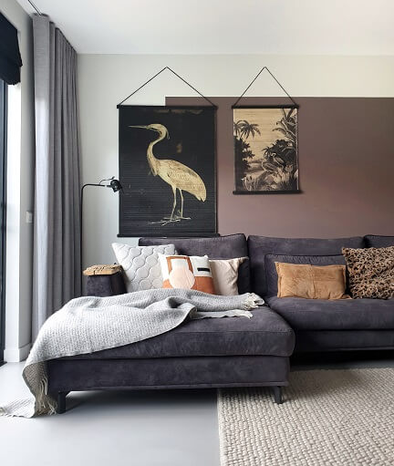 Ja, dat kan je wel zeggen! Al in januari wist ik dat de bank zwart velvet was en vanaf dat moment gingen mijn hersenen aan de slag met een plan. Dat viel niet mee. In basis hou ik namelijk enorm van natuurtinten in huis. Grijstinten, natuurlijke materialen, oud hout, warme stoffen etc., maar ik was ook wel toe aan een uitdaging in de vorm van wat kleur want het werd allemaal wel heel erg grijs.